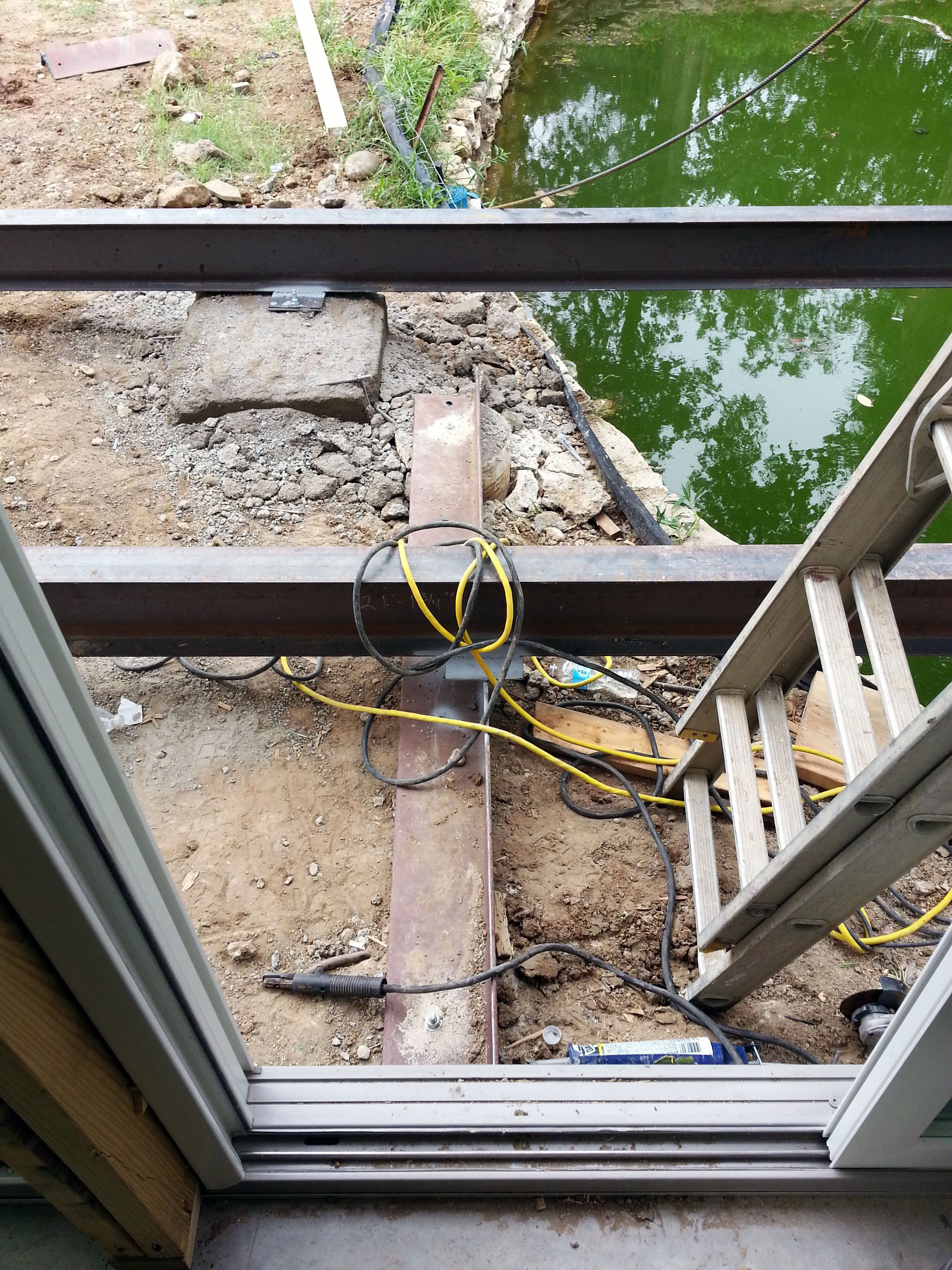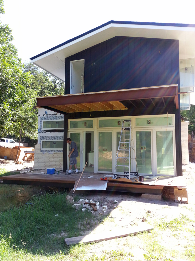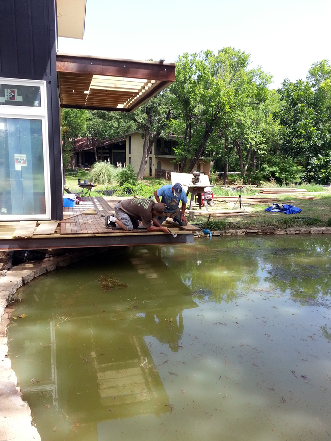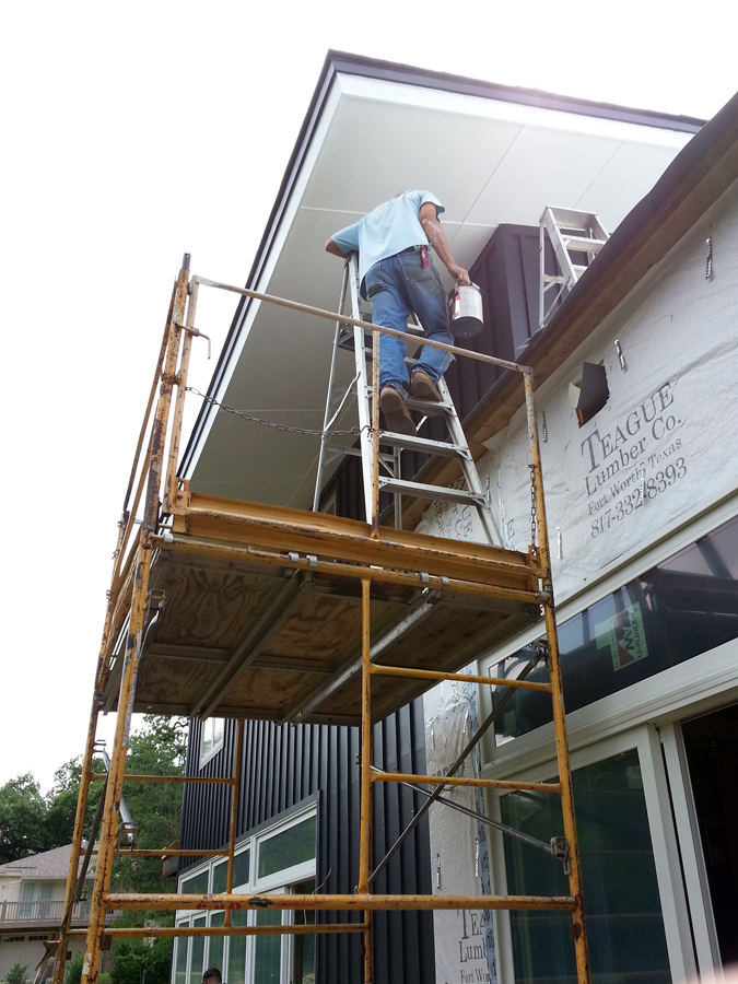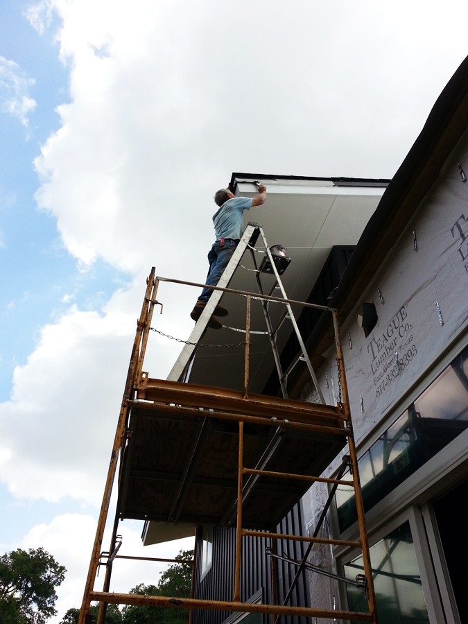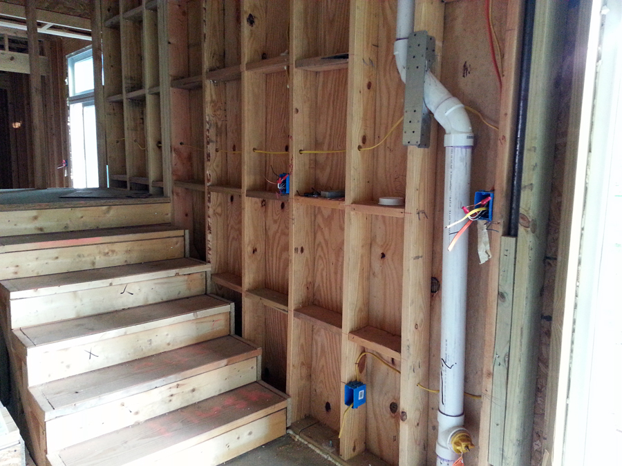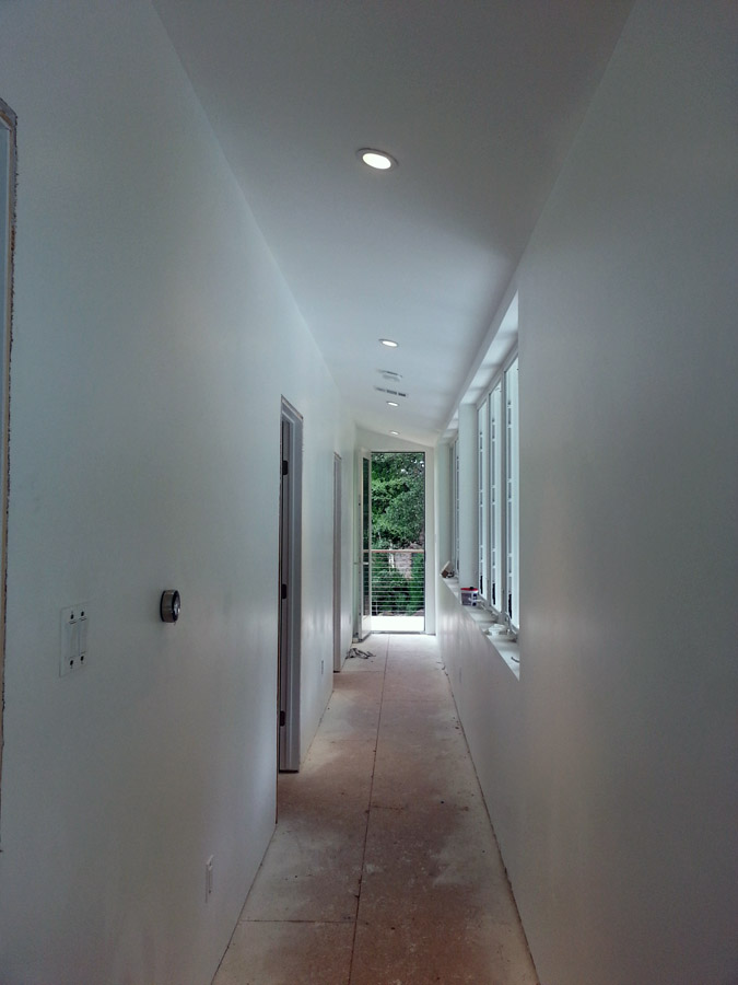 Please note the working lights! During the time between dyeing the floor on the first level and finishing the stairs, we passed our electrical inspection, Oncor installed the meter, and our electricity was finally switched on. That whole process was a pain in the left buttock. That’s all I’m going to say about that.