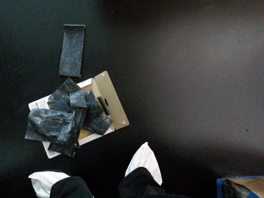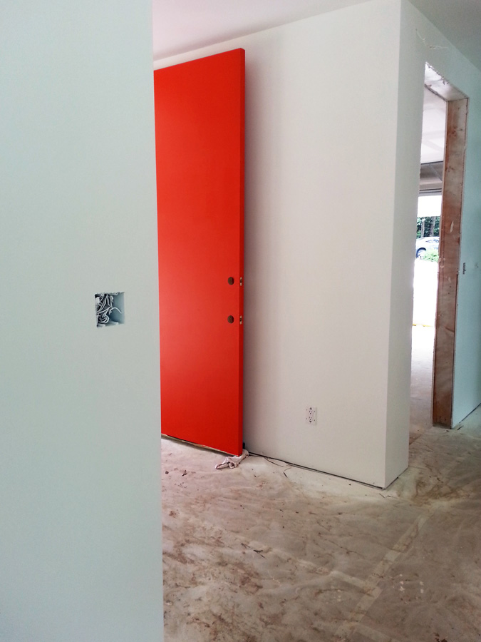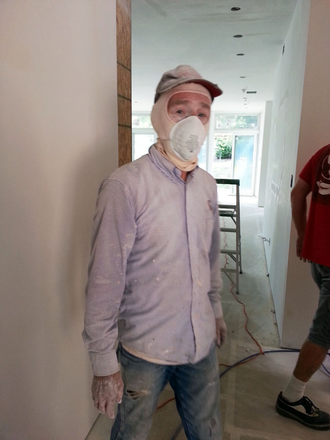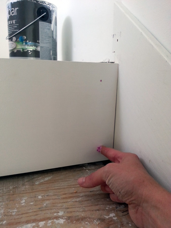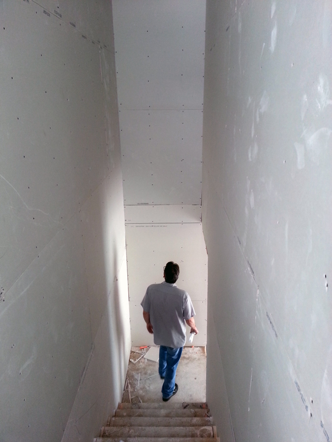 Not pictured: Mother-in-law scooting around the floor on “Rube the Cube” (a wooden box on casters), Popsicle stick in hand, scraping from the floor blobs of dried mud left from the taping and bedding process. Why a Popsicle stick and not something bigger, such as an actual paint scraper? We don’t know and at this point in the process it was too much work to ask too many questions. She, Rube, and that little stick got the floor spotless and that’s all that matters.