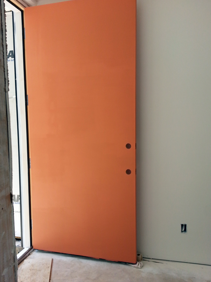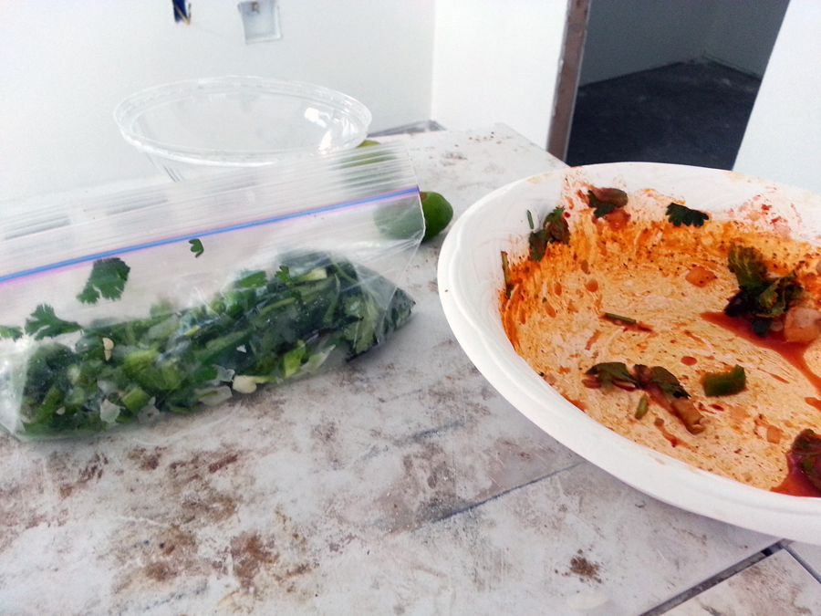 Below is a picture of my stellar job of taping off the walls with plastic. I first lined the walls with heavy paper, then thought better of it because of the amount of water I expected us to use. I loathe doing things twice and this picture shows both my skill and attention to detail on the second go-round. Have you ever seen better tape placement? In my defense, this is the kitchen and I expected most of the mess would be covered up by cabinets (spoiler alert: It was!). I’m defenseless in explaining the dye on the front door, the fireplace brick and the far corner window in the dining room.