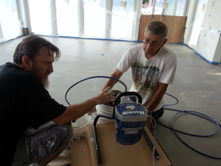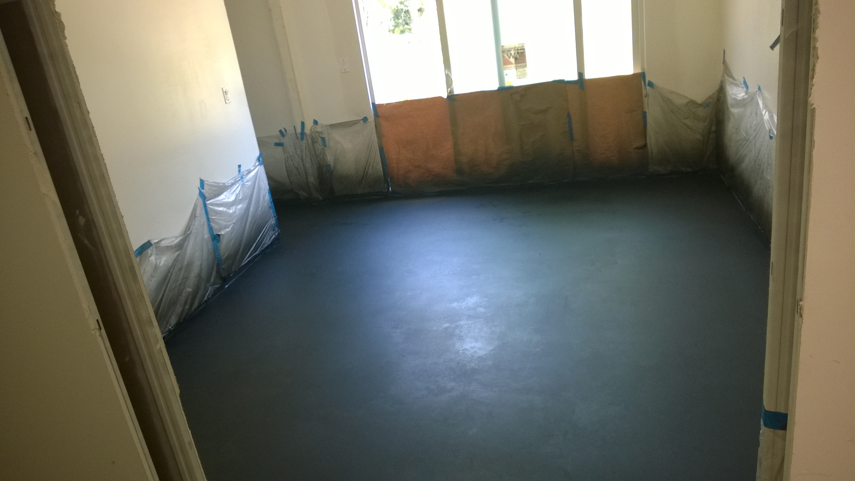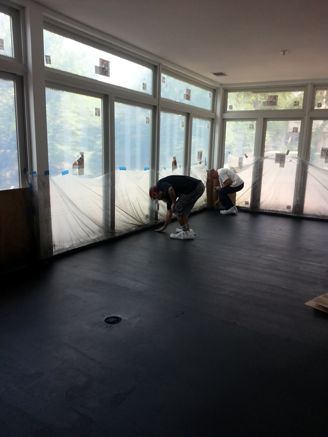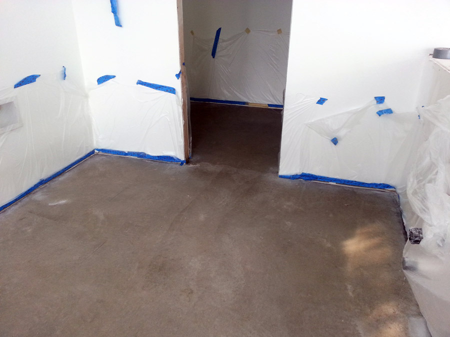 Not pictured: Mark spreading a non-corrosive biodegradable gel on the floor to prepare “a concrete substrate by producing a moderate surface texture.” In other words, an acid that etched away a bit of the concrete so the dye could penetrate better. We found it worked great at exfoliating the soles of feet too. Why did we stand barefoot in the middle of this stuff? See two paragraphs up about asking questions.