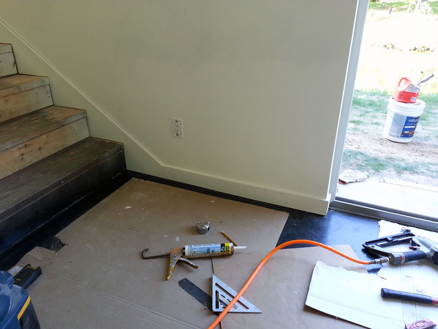 Voila! A floor and almost finished baseboards (still needed: nail filling, caulk, and a final coat of paint).