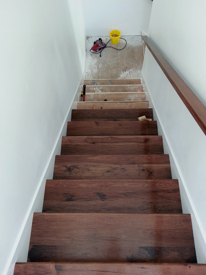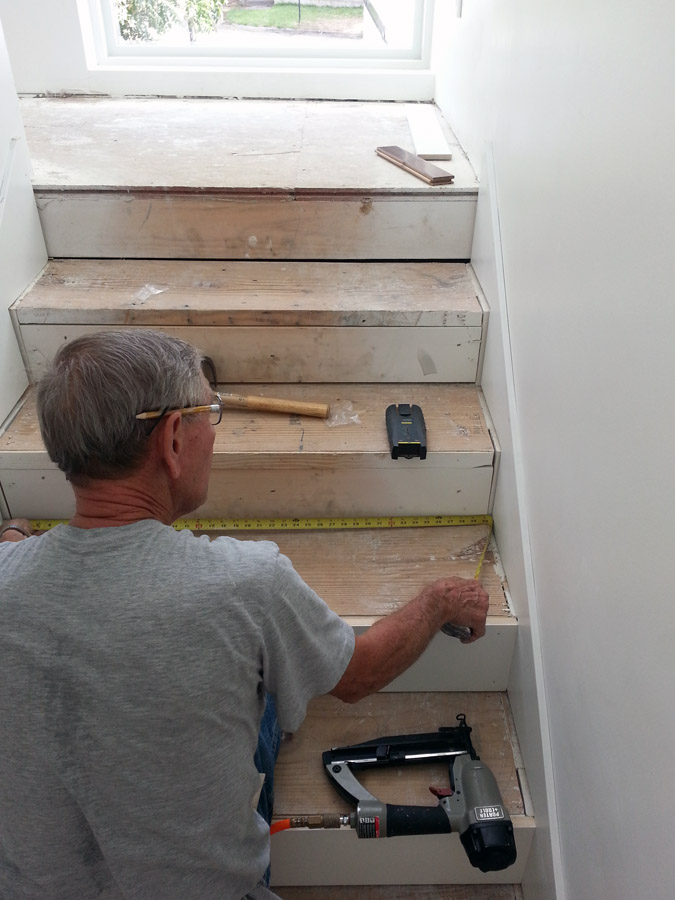 Then we started work on the stairs. While we were on our hands and knees wet sanding the floor, the in-laws did most of the stair prep at the workshop at their house. They sanded, stained, and sealed all the treads and the handrails. I’m certain they saved our lives.