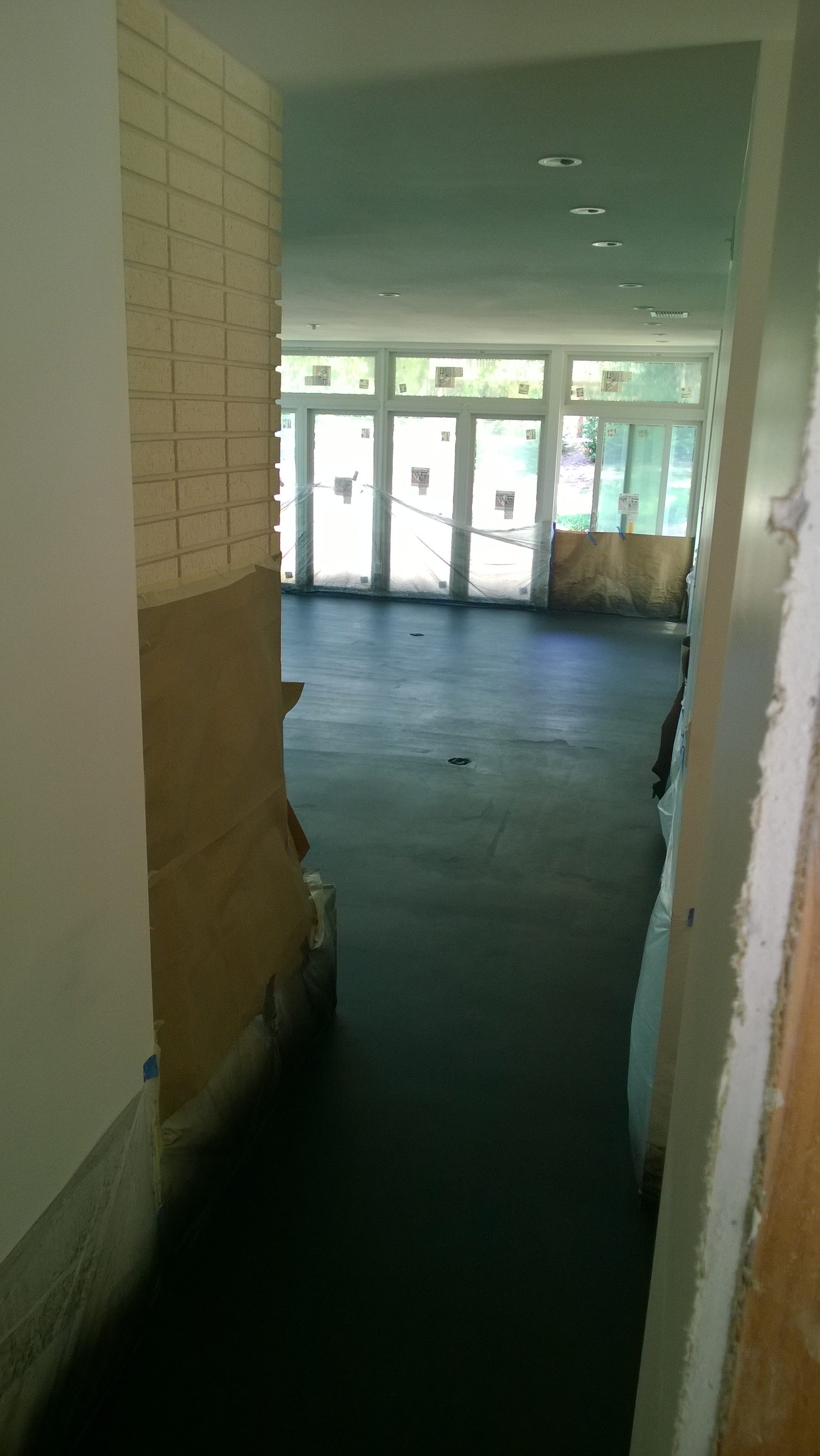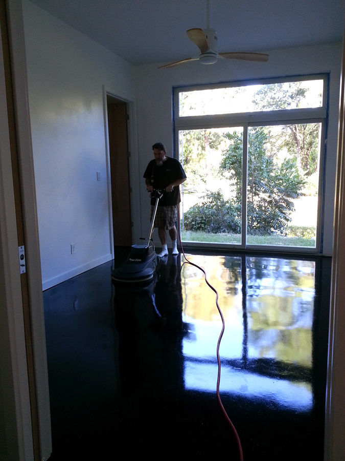 Now we go back downstairs to see Mark burnishing the concrete floors.