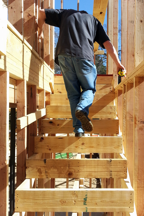 We have stairs now, which makes getting to the second floor so much easier. There was a moment when I swear we looked like a couple of apes swinging from trees trying to get up there before they installed the bottom half of the stairs. A moderately dislocated shoulder and bruised hip bone gave me a whole new appreciation for a well crafted graduated incline. Sorry, no pictures of the monkeying around.